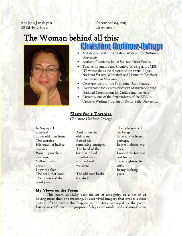 Elegy for the giant tortoises original wording on the road where i stand they will materialize plodding past me in a straggling line awkward without water paraphrase they the tortoises will appear on the road where i stand walking slowly by in a scattered line looking clumsy because they are not in the water. Elegy for the Giant Tortoises by Margaret Atwood Let others pray for the passenger pigeon the dodo the whooping crane the eskimo. Poems may be submitted to Anders GJ.