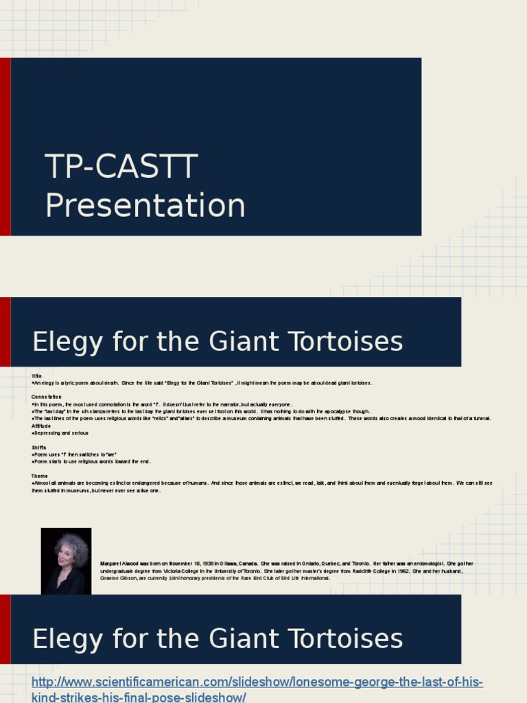 The speaker in the Elegy for the Giant tortoises expects to see the tortoises. Margret Atwood was born in Ottawa Ontario Canada the second of three children of Margaret Dorothy a former dietitian and nutritionist from Woodville Nova Scotia and Carl Edmund Atwood an entomologist. Aldabra Atoll and Fregate Island in the Seychelles and the Galápagos Islands in EcuadorThese tortoises can weigh as much as 417 kg 919 lb and can grow to be 13 m 4 ft 3 in long.